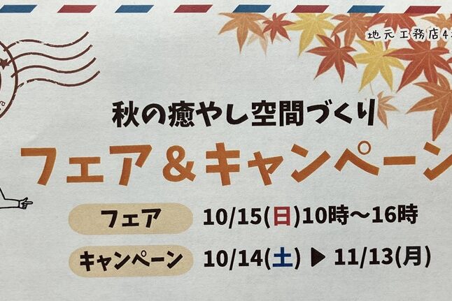 秋のリフォームフェアを開催します\(^o^)/ 今回のテーマは「癒し」 日にち:10月15日(日) 時間:10…