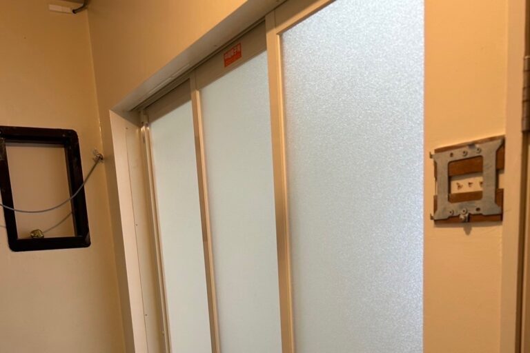国立市にて、浴室入口の折戸から3枚引戸への交換工事が完了しました。 タイル張り在来工法の浴室からユニットバスに…