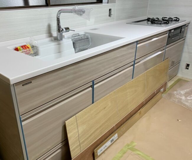 立川市にてキッチン組付け設置工事第一日目の作業が完了し 本日は、電気配線工事、水道配管結び込み工事に入らせてい…