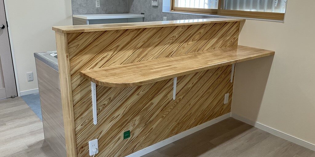 リビング側のカウンター立上り部分は羽目板を斜めに張りましたので