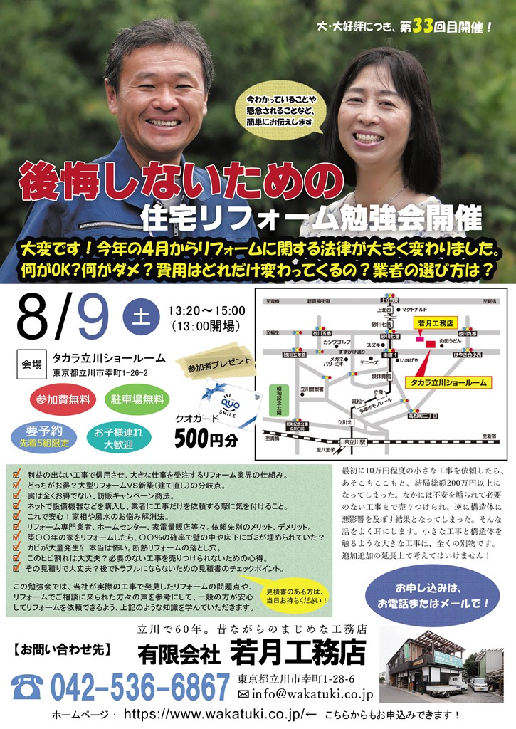 8/9(土)第33回「後悔しないための住宅リフォーム勉強会」開催!