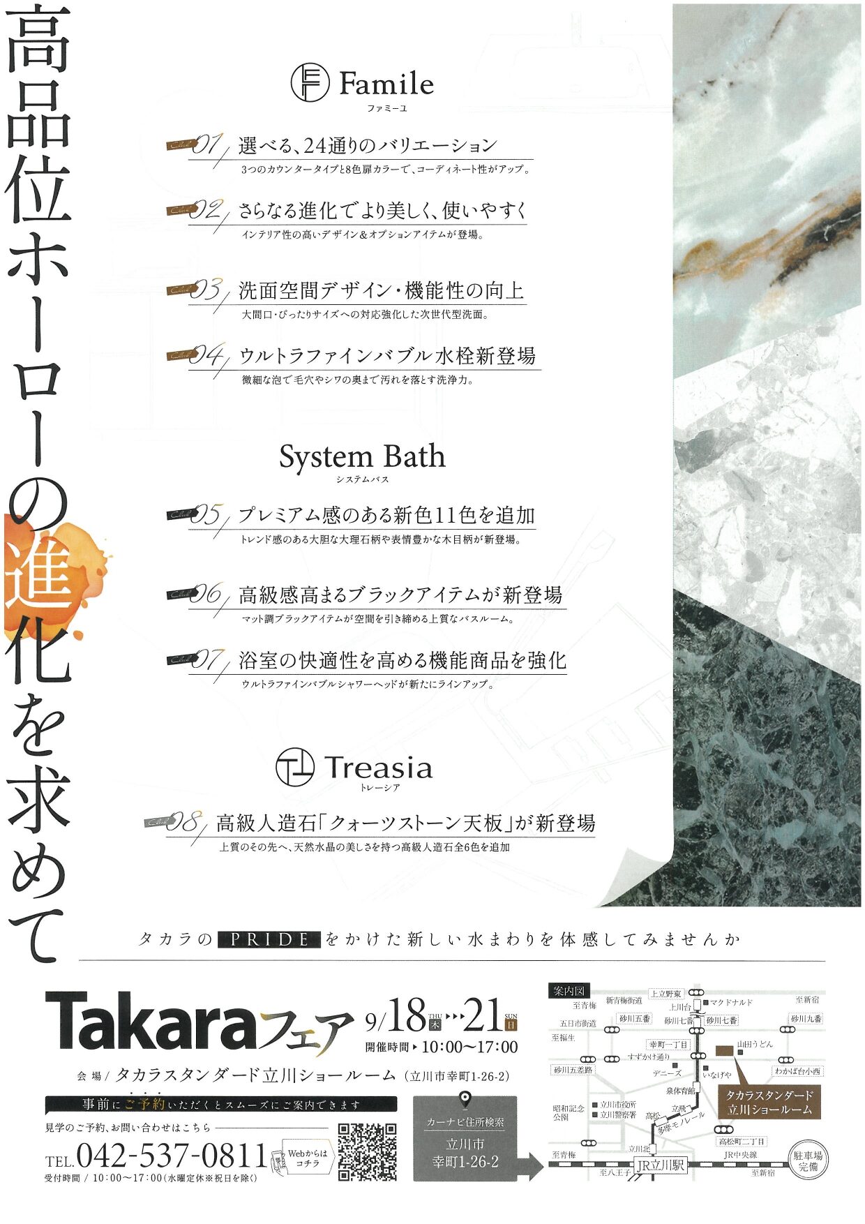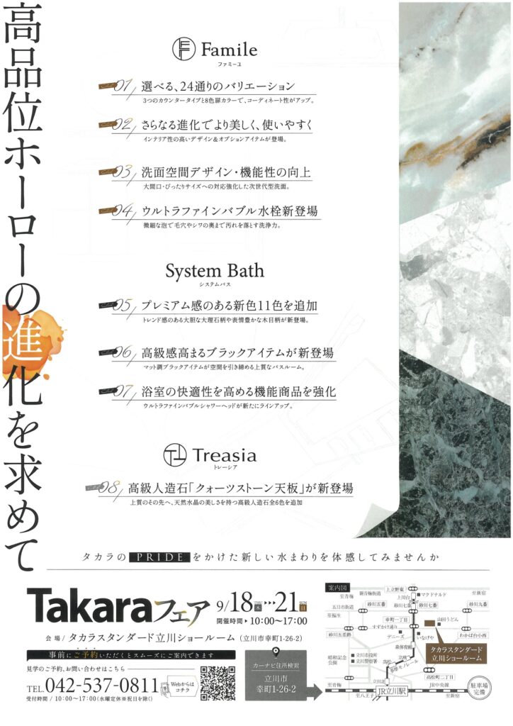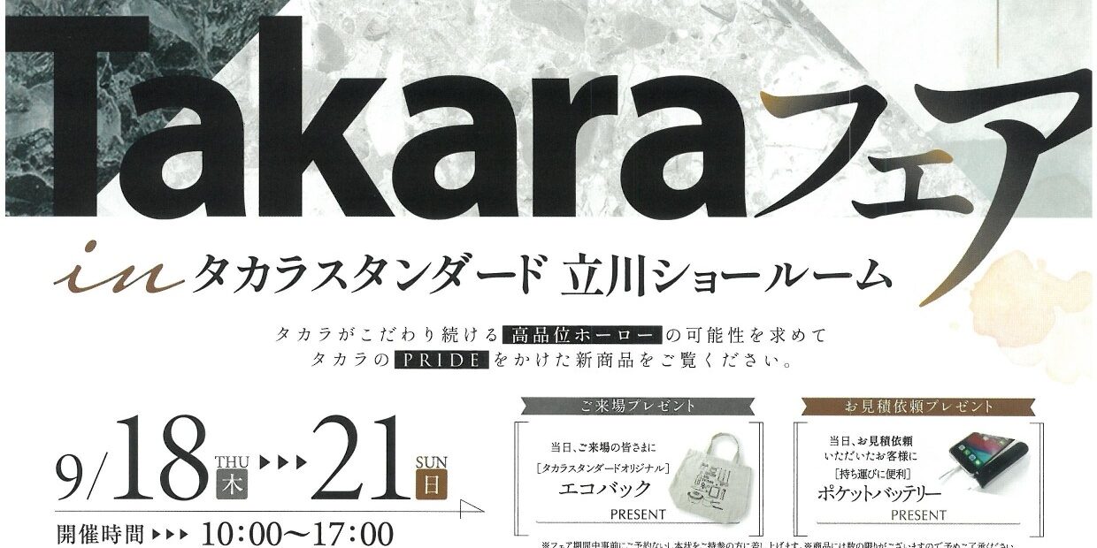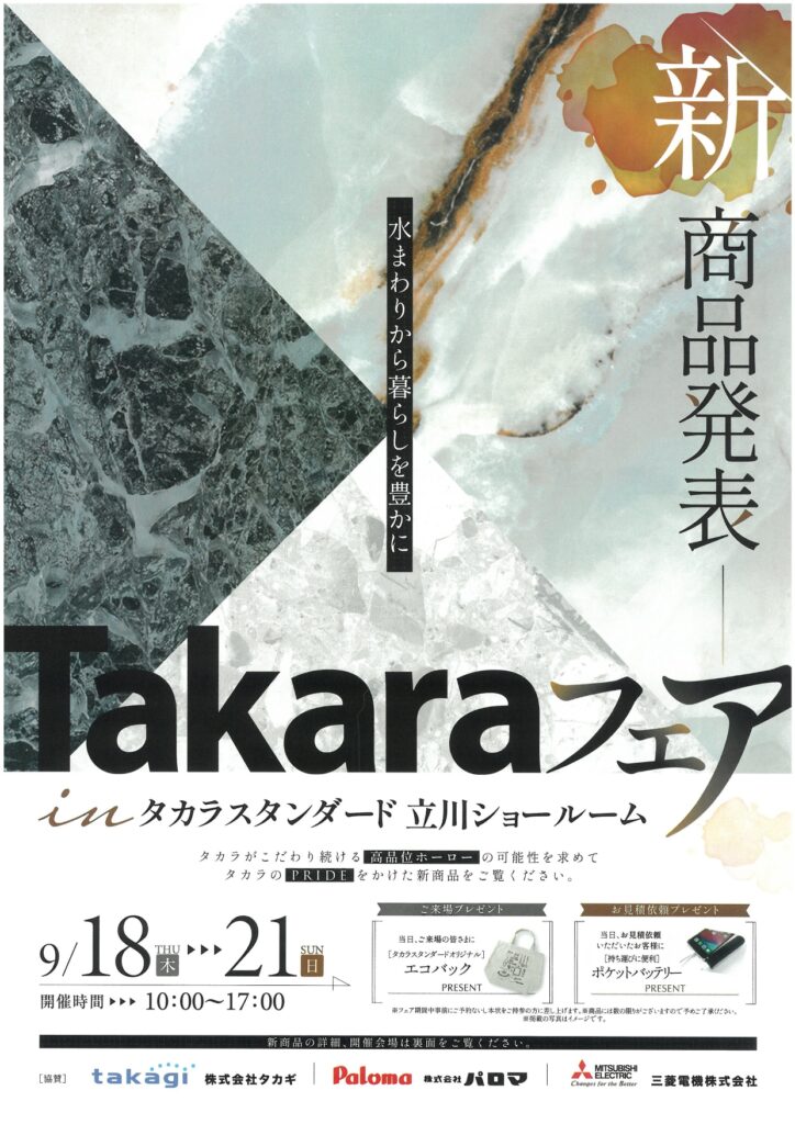 8月192025ニュース 9/18(木)~9/21(日) に「タカラフェア」を開催します。 場所:タカラスタンダード立川ショールーム (立川市幸町1-26-2) 時間:10:00~17:00 〇 キッチン・システムバス・洗面化粧台の新商品をご覧になっていただくことができます 〇 ご来場の方にタカラスタンダードオリジナルエコバックのプレゼント 〇 お見積り依頼をいただいた方にポケットバッテリーのプレゼント などの特典があります(*^^*) ぜひ新しい商品を体感してみてくださいね。 お待ちしております✿ Category: ニュースBy 若月 麻美2025年8月19日 Author: 若月 麻美 Post navigationPreviousPrevious post:立川市にてリフォーム工事NextNext post:パントリー関連記事【給湯省エネ2025事業】撤去加算措置の予算に対する補助金申請額の割合が90%に達しました2025年10月22日予算に対する補助金申請額の割合2025年10月12日10/11(土)第34回「後悔しないための住宅リフォーム勉強会」開催!2025年9月15日夏季休業のおしらせ2025年8月14日8/9(土)第33回「後悔しないための住宅リフォーム勉強会」開催!2025年6月25日6/15(日)第32回「後悔しないための住宅リフォーム勉強会」開催!2025年5月16日